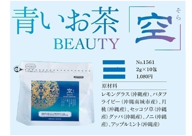 沖縄産バタフライピーは外国産に比べポリフェノールが多く希少品種。レモングラスや月桃、シークヮーサーなどを配合し、見た目がさわやかで美容にもうれしいお茶です。